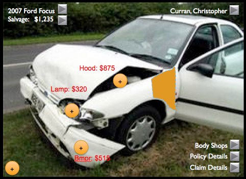 We sat down and brainstormed how augmented reality style app could help a claims adjuster process an automobile accident. Nothing fancy but we came up with a few ideas like the ability to recognize car makes/models, show prior damage reported directly on the image of the car, the ability to mark damaged parts of the car to get repair quotes and to find the closest repair facilities. Getting all of this information at the ‘point-of-claim’, assessing and adjudicating the claim makes the process relatively painless for the consumer, avoids fraud and padding substantially, and streamlines the claims processing immensely.